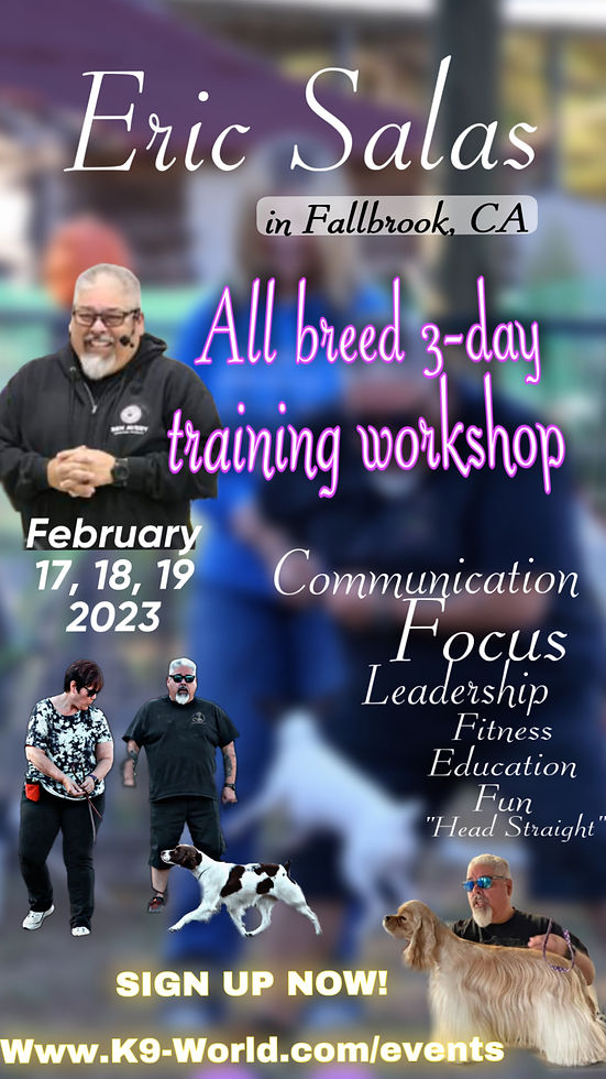 This video is from one of the classes Eric Salas has a video of on his YouTube channel. He is not only good for show dog training, but he has advanced techniques in building a relationship with your dog to build focus, and leadership. The techniques and philosophies that Eric teaches is not commonly practiced throughout the dog world, but it should be!!!!
